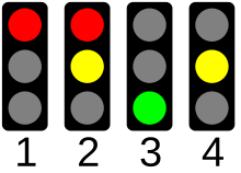 Polski kodeks ruchu drogowego dokładnie opisuje znaczenia poszczególnych sygnałów wydawanych przez sygnalizator w poniższej kolejności.